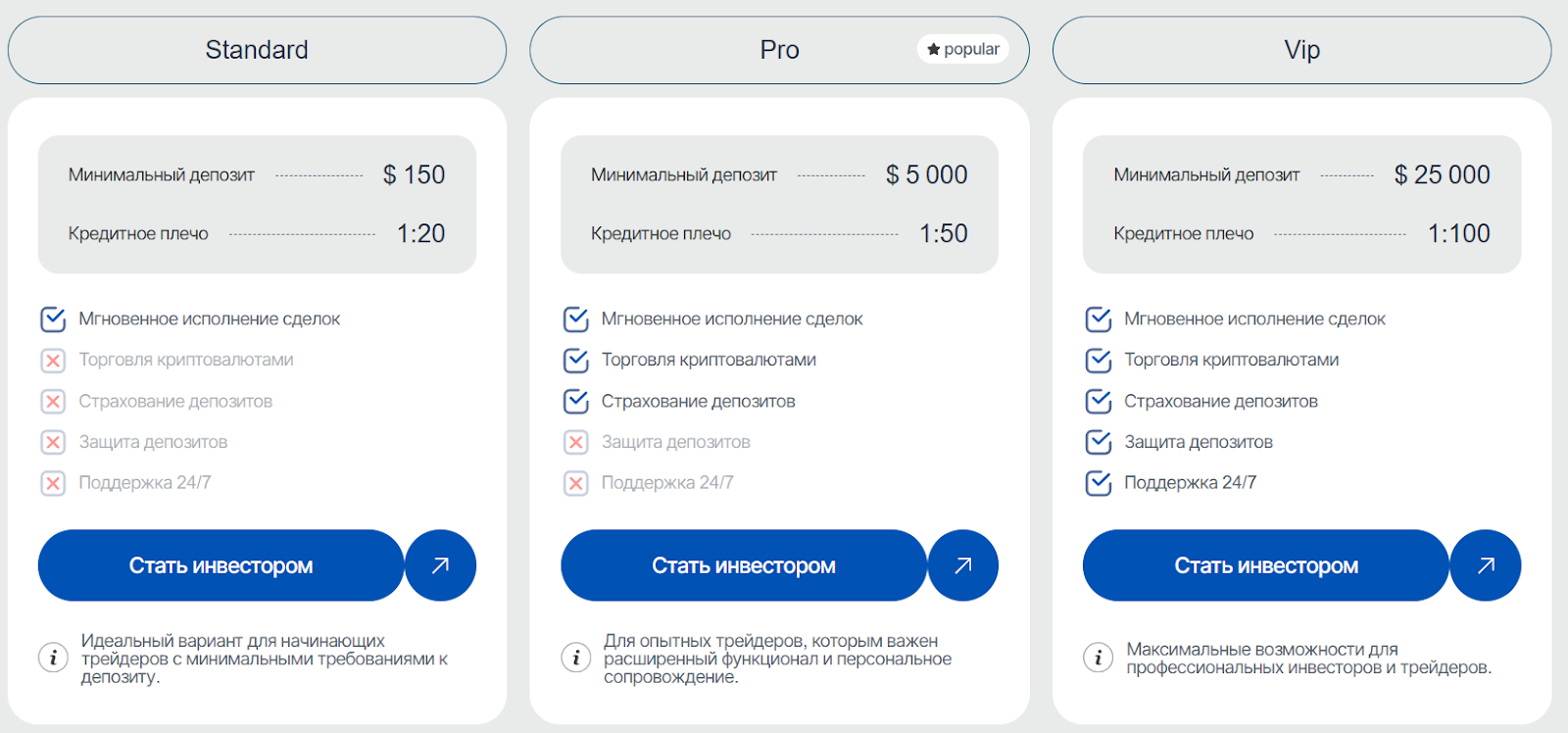 - VIP – вклад от 25 тысяч долларов, кредитное плечо 1:100, открывает максимальные возможности.