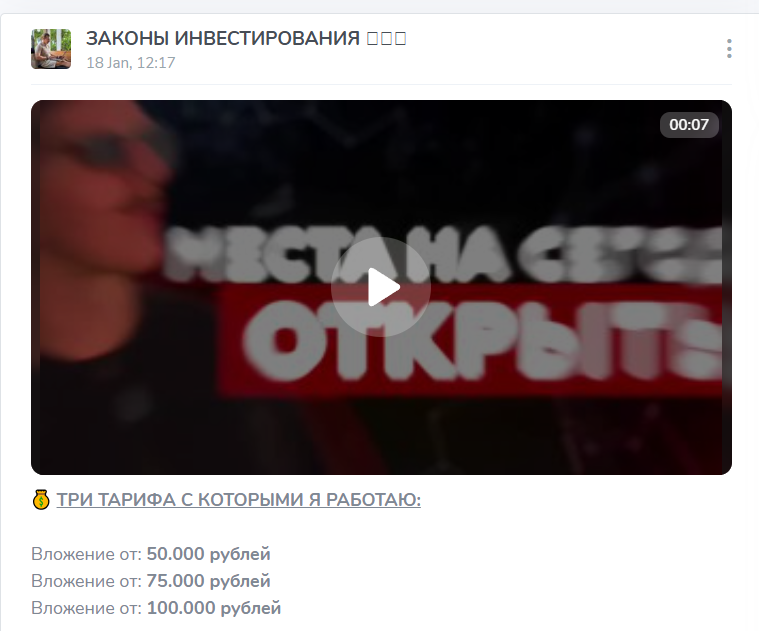 При этом в публикациях есть не только отзывы о канале в Телеграмм «Законы инвестирования», но и информация о тестовых вложениях в размере ₽5,000.