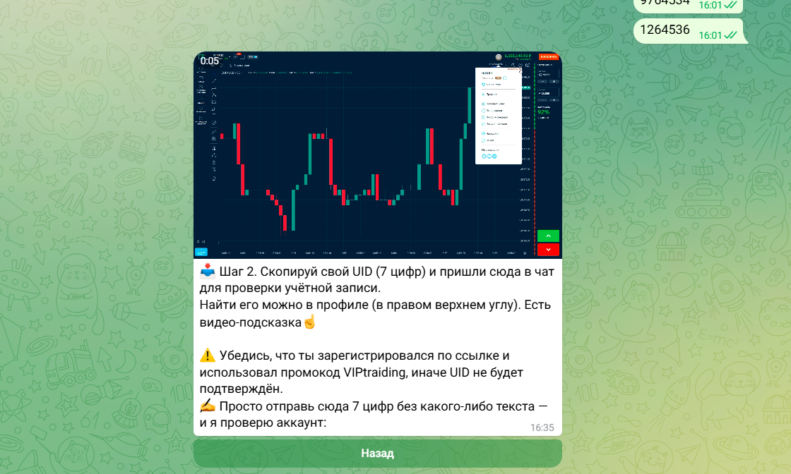 Формально вход бесплатный, но на деле для доступа нужно зарегистрироваться на Binarium по аффилированной ссылке, ввести промокод и передать UID.