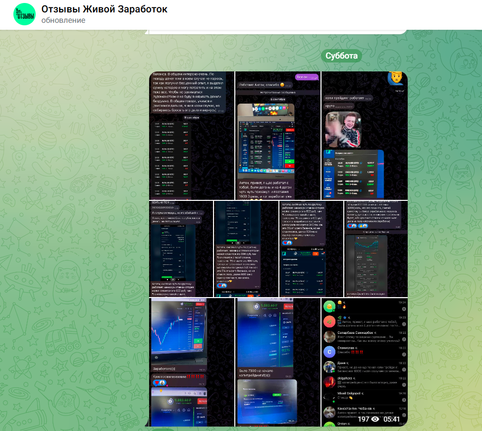 История с ботом “Живой Vip Клуб” в телеграмме выглядит правдоподобно: обещания заработка, лозунги с призывами и отдельный канал с отзывами на 738 участников, где выкладываются сотни скриншотов успешных сделок. Там люди якобы делятся своими победами, показывают графики, радуются быстрым выплатам.