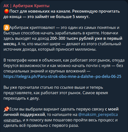 Аферист обещает положительный результат арбитража по его связкам с 2023 года. Его первый ТГ канал Perepelitsa Official «Арбитраж Криптовалют» обещал более скромный доход – всего 2 – 8% за один круг. Но позже мошенник перестал стесняться и начал гарантировать огромную прибыль на арбитраже каждому.Еще один закрытый ТГ проект этого трейдера «Ak крипта P2P Арбитраж» существовал всего два месяца, но успел принести убыток большому количеству доверчивых новичков.