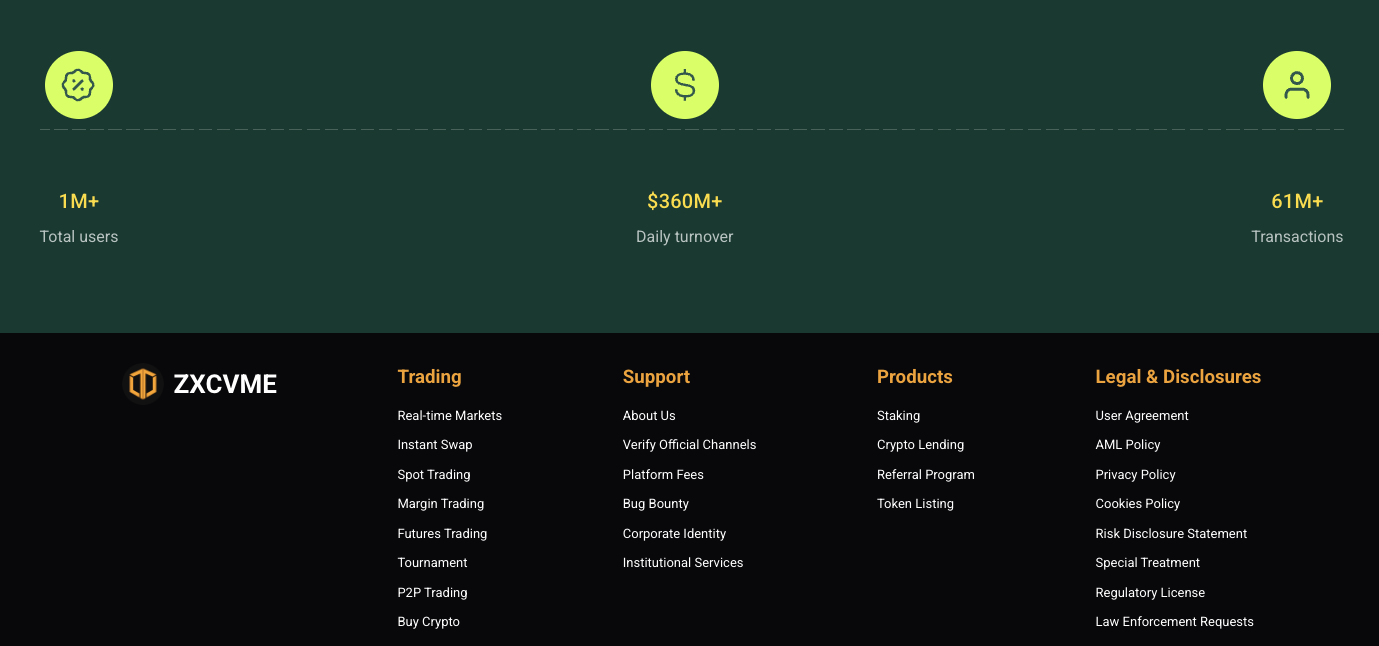 Также создателями платформы сказано, что общее количество зарегистрированных на бирже zxcvme com пользователей превышает миллион человек, а ежедневный оборот на ней достигает 360 миллионов долларов.