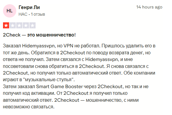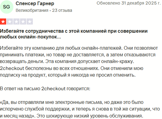 На Trustpilot почти 2,5 тысячи отзывов о 2Checkout. Средняя оценка 1,9 из 5. Большинство негативные.