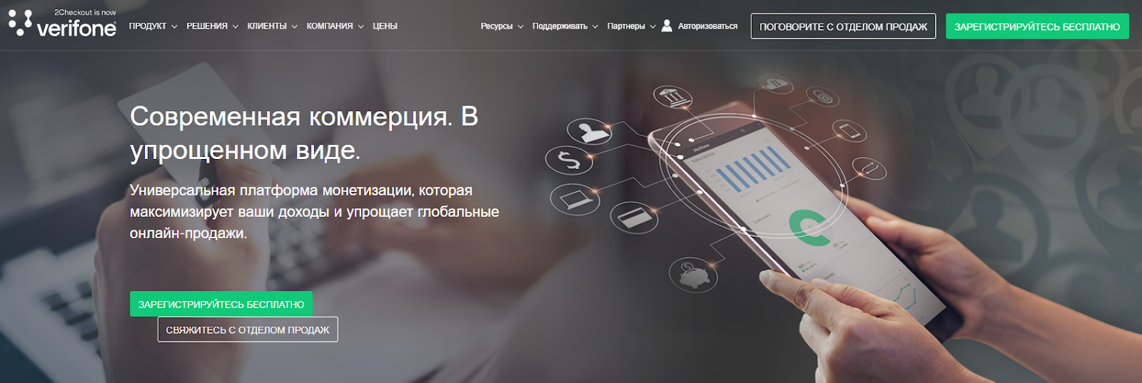 Домен 2checkout com был создан еще в 1999 году. Это подтверждает долгую работу. Сайт выполнен в светлых тонах с минимумом графики. Меню разделено на разделы – продукты, решения, клиенты, компания. На главной странице перечислены основные преимущества.