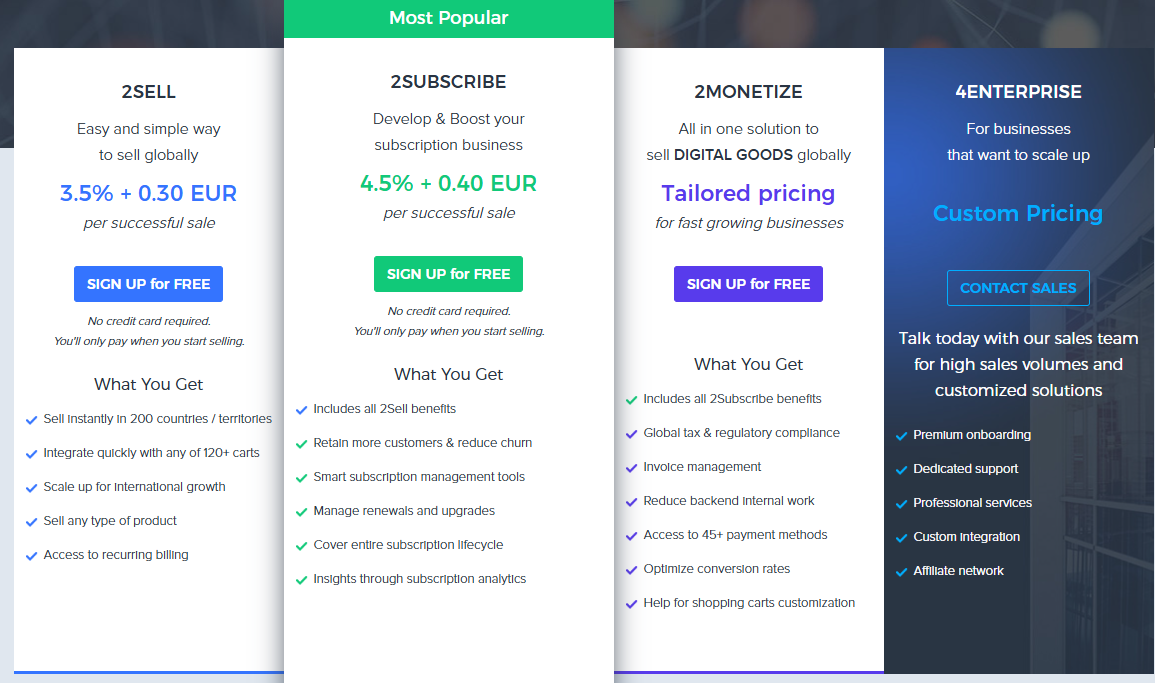 2 Checkout предлагает четыре варианта сотрудничества с разными ценами и функциями:- 2Sell берет 3,5% + 0,30 евро с каждой успешной транзакции. Кредитная карта для регистрации не требуется. Оплата начинается только после первых продаж. Доступны продажи в 200 странах и интеграция со 120 корзинами покупок.