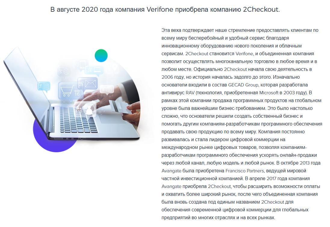 Francisco Partners купила 2 Checkout в 2013 году. Через четыре года случилось слияние с Avangate. Verifone выкупила весь бизнес в августе 2020 года. Сейчас через систему проходит 14 миллиардов транзакций ежегодно. Больше двадцати тысяч компаний пользуются сервисом.