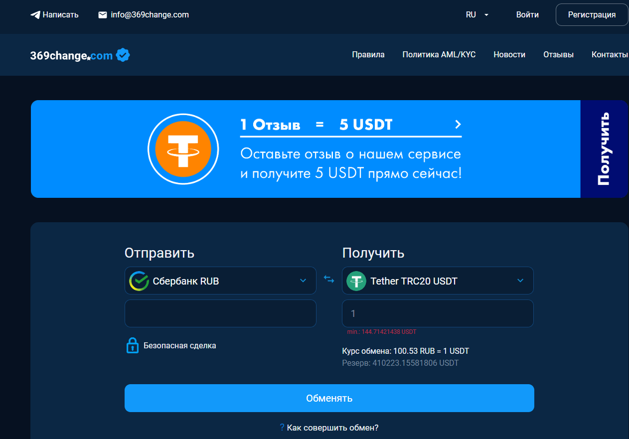 Обмен можно совершать круглосуточно, транзакции производятся автоматически. Для связи со службой поддержки есть email info @ 369change com, форма обратной связи на странице Контакты и ссылка на аккаунт менеджера в ТГ @change369. Отвечает саппорт быстро, в любое время дня и ночи.