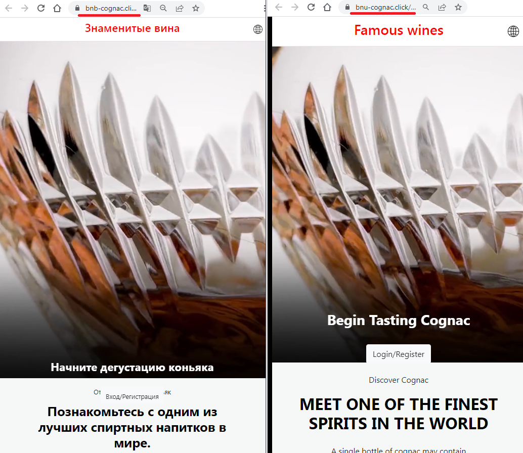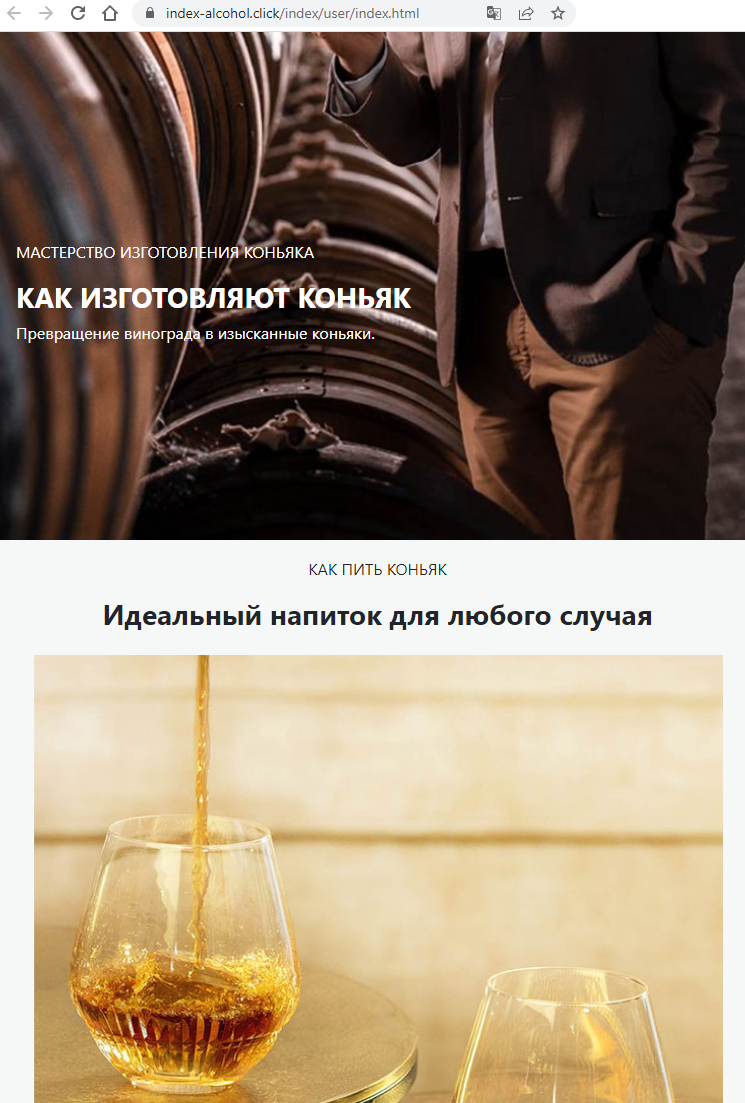 На официальном сайте проекта «Абб Когнак» посетителей встречает заголовок «Начните дегустацию коньяков». Дальше авторы их переводят на вход или регистрацию. Стоит заметить, что переходя по адресу https://abb-cognac.click, нас перебрасывает на ресурс https://index-alcohol.click.
