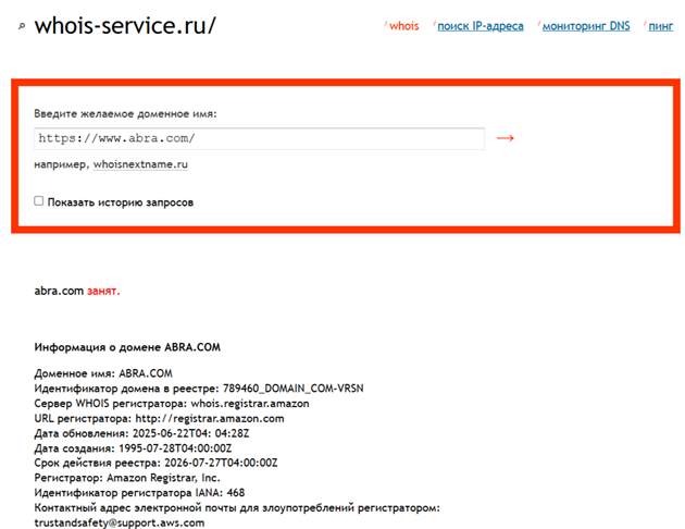 Важный момент – проверка срока работы сайта Abra Exchange. Информация на Whois-service показала, что доменный адрес появился в 1995 году, но указанная площадка приобрела его в 2025 году, что подтверждено соответствующей записью. Обновление произошло 22.06.2025 г, а действует доменный адрес до 27.07.2026 г.