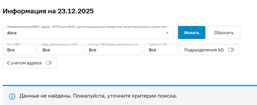 Сервис Abra Exchange работает без лицензии ЦБ, что мы узнали в ходе проверки информации на сайте главного регулятора. Данный факт служит подтверждением, что площадка работает в РФ незаконно, поэтому любые финансовые операции на ней опасны. В случае каких-либо проблем не получится защитить свои права.Работа на сайте криптовалютного кошелька Abra Com имеет регуляторные риски. Дело в том, что в законах постоянно происходят изменения относительно деятельности таких сервисов, поэтому дальнейшая судьба подобных площадок неизвестна. Есть риск блокировки данных сайтов, с которых не получится вывести средства. Еще пользователи сталкиваются с техническими рискам – сбоями в функционировании площадки и кибератаками, что может привести к денежным потерям.
