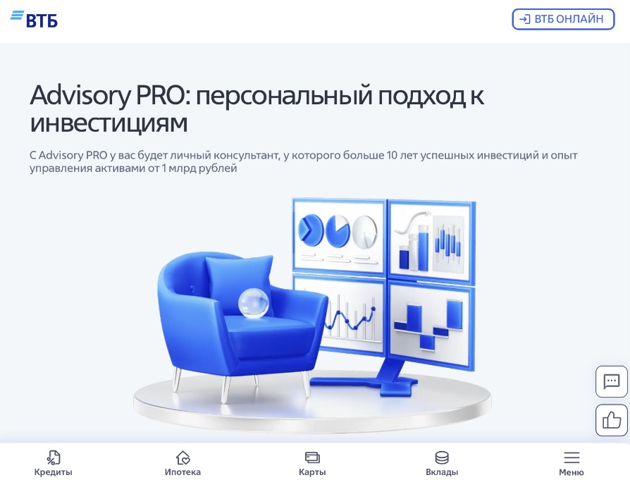 Проект Advisory Втб представляет собой индивидуальное консультирование и подбор оптимальной инвестиционной стратегии, согласно запросам и возможностям клиента, а также их соответствию реальной рыночной ситуации.