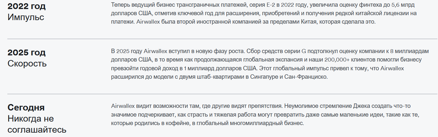 На лендинге платежной системы немного информации про организацию Air Wallex. Один из разделов содержит описание ее «истории», однако мы видим крайне мало конкретики. Аферисты говорят про «новую фазу роста», «многомиллиардный бизнес из небольшой идеи», но не приводят никаких доказательств своего успеха.