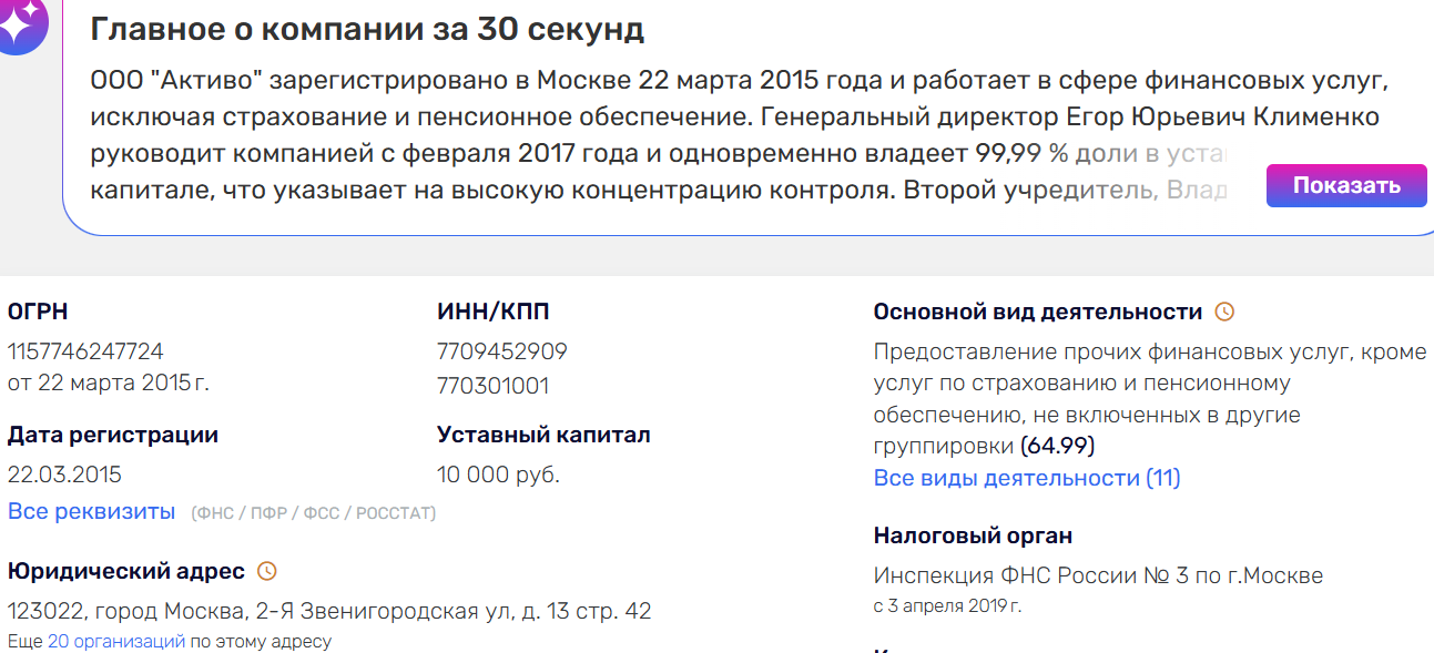 Компания официально зарегистрирована в России как ООО “Активо” и присутствует в реестрах, а ее центральный офис находится в Москве. Паи Активо торгуются на Московской бирже.