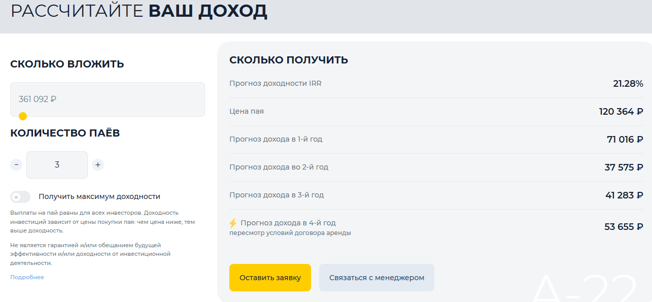 Пай Активо на момент этого обзора стоит 120 000 рублей, а для инвестиций нужно купить минимум 3. Среднюю доходность обещают на уровне 21% годовых: такие прогнозы построены по результатам прошлых периодов. Тем, кто покупает от 10 паев, обещают повышенную доходность.