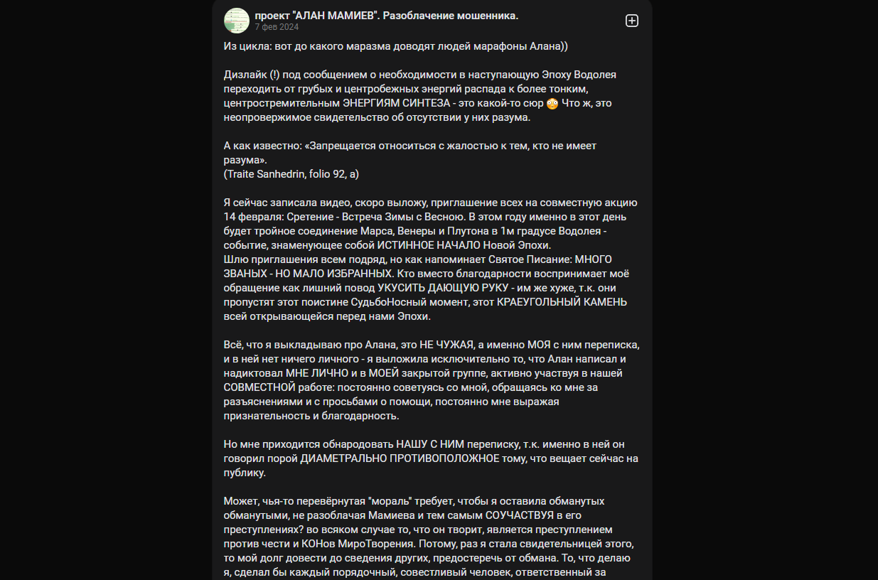 Также есть возмущенные отзывы, указывающие на искаженную трактовку базовых учений эзотерики. Пользователи пишут, что Алан Мамиев — мошенник и не стоит верить всему, что он говорит в марафонах.