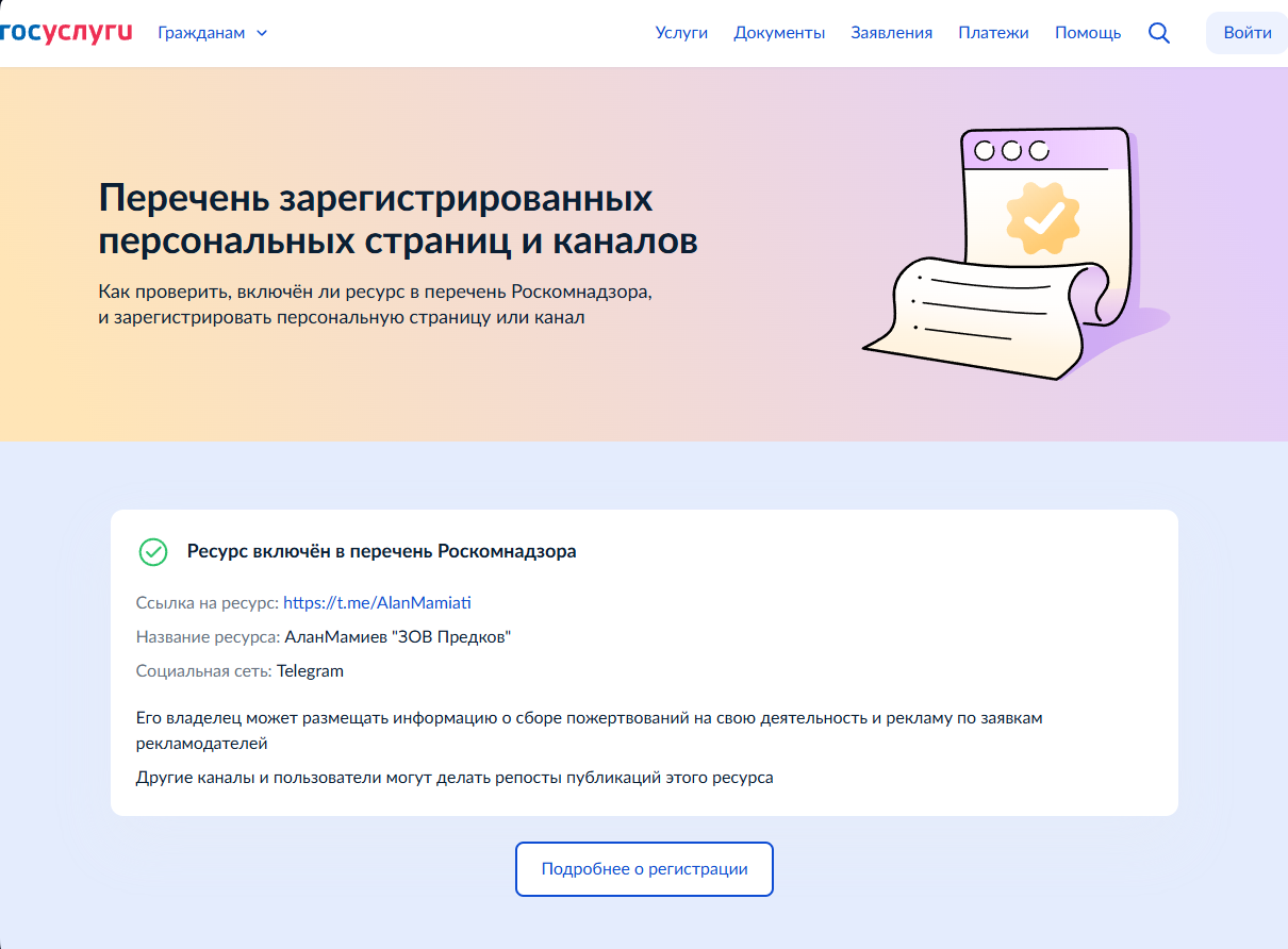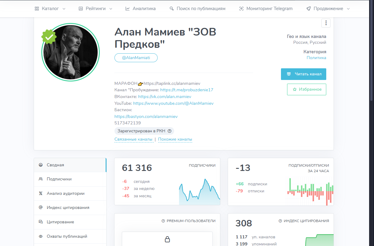 На канале примерно 61 000 подписчиков, а посты просматривают от 8 000 до 11 000 участников. ERR держится на уровне 5–6%, то есть около трети аудитории реально читает материалы. Официальная регистрация в Роскомнадзоре подтверждает легальный статус, но одновременно под брендом регулярно всплывают фейковые страницы вроде AlanMamiev, предлагающие быстрый заработок на крипте.