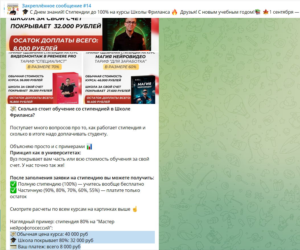 В тг канале указано, что есть также обучение со стипендией, когда студент оплачивает только часть курса и цена может составить 8 тысяч рублей.
