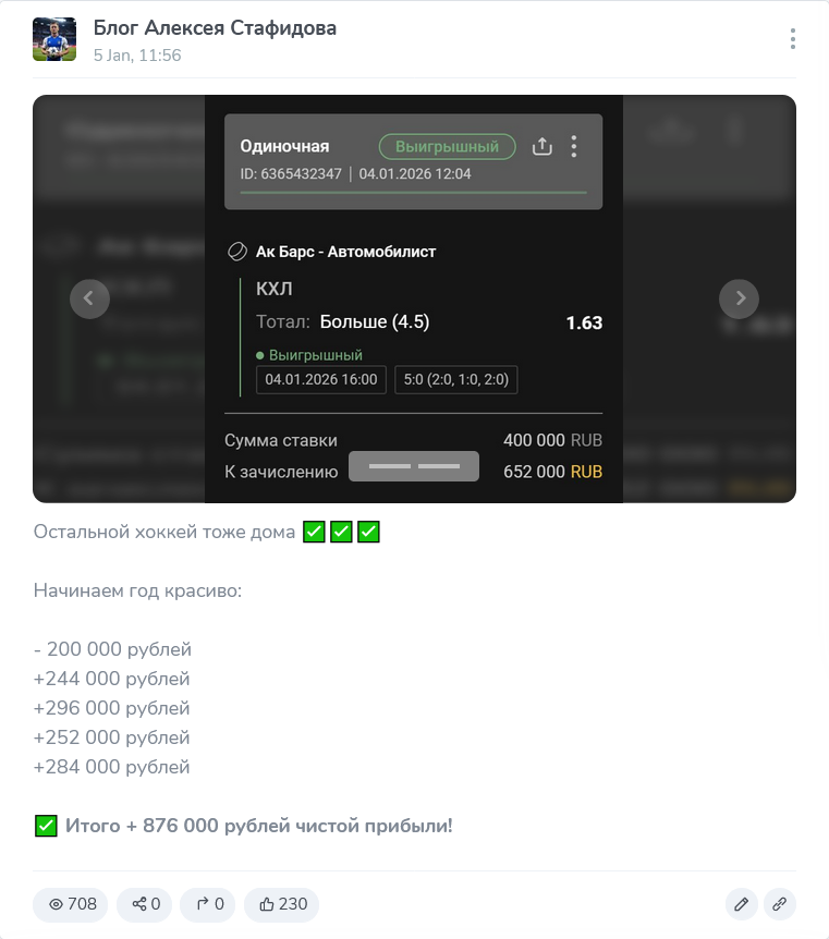 Отзывы о канале в Телеграмм «Блог Алексея Стафидова» в интернете противоречивые. Капер публикует бесплатные прогнозы на футбол и хоккей с высоким коэффициентом проходимости. Можно ли доверять спортивному аналитику – выясним в данном обзоре. Также узнаем, с какими букмекерами сотрудничает «гуру» и изучим отклики его клиентов.