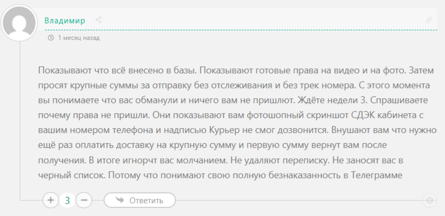 Единственный контакт для связи — профиль Александр Берестов в Телеграмме. В описании говорится, что автор изготавливает водительское удостоверение любой категории. Именно сюда предлагается писать для решения возникших вопросов.Администратор гарантирует быстрое оформление документов, но по факту подход совершенно другой. Сначала человек вынужден предать предоплату. Чаще всего ее размер составляет не менее 50% от стоимости документов. После этого на какое-то время Александр пропадает.