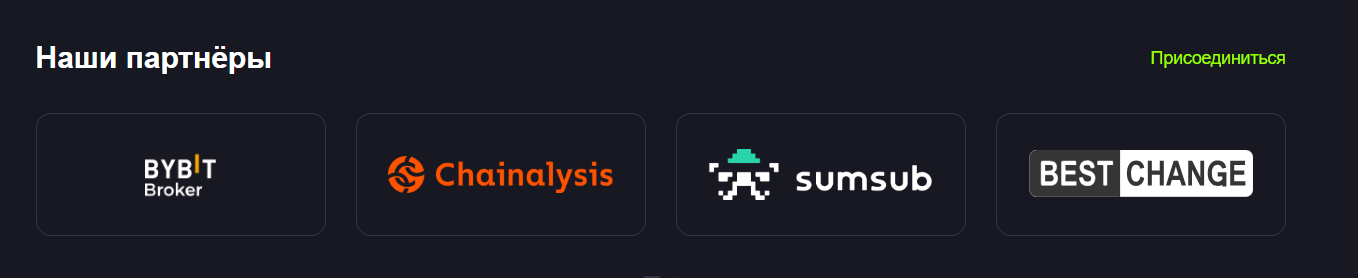 Партнерами Альфабез являются Bybit SumSub, Chainalysis и BestChange.