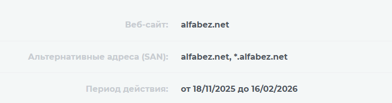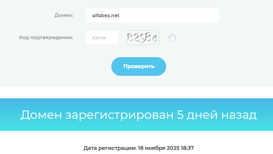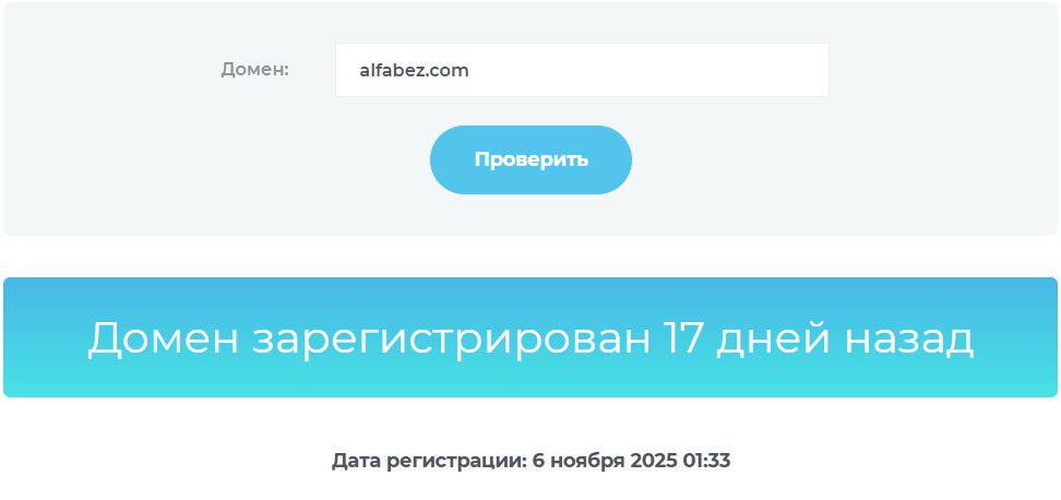 Проверка показала, что домен alfabez net был зарегистрирован 18 ноября 2025 года. Это очень короткий срок, чтобы делать выводы по поводу надежности компании.