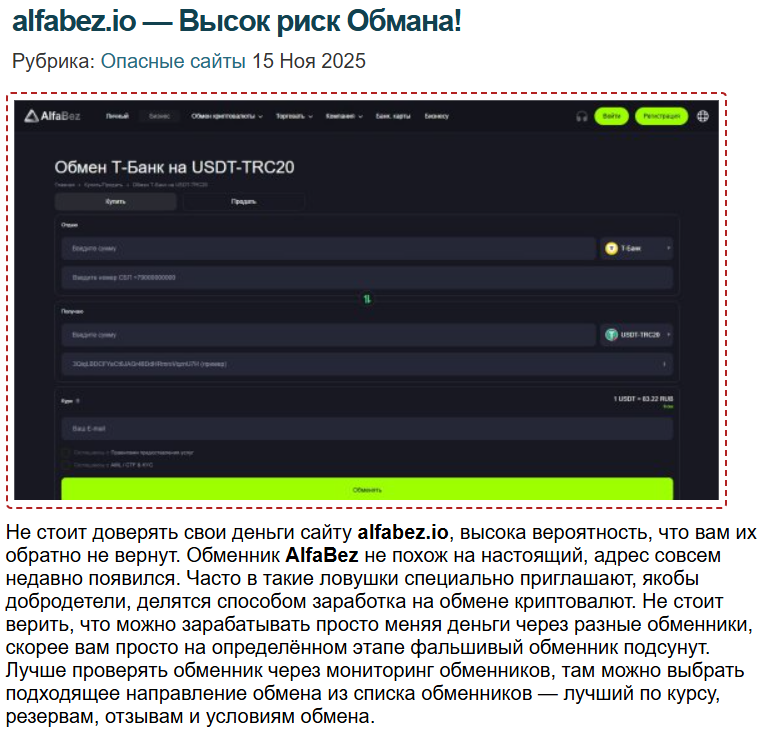 В интернете было найдено предупреждение о том, что alfabez io — это опасный сайт, его пользователи рискуют потерей денег.