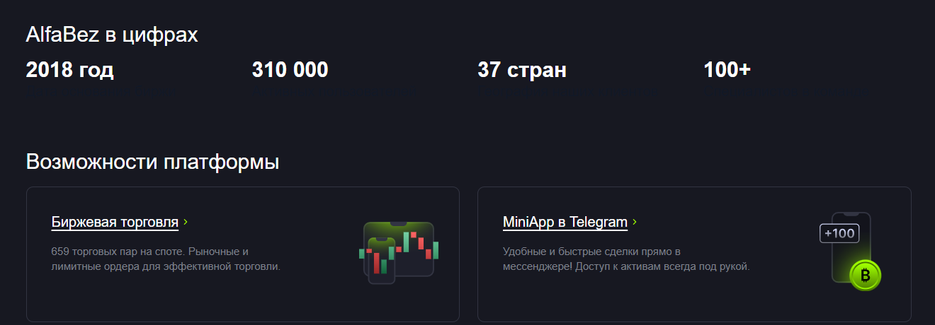 Алфабез представляют как многофункциональный обменник. Он появился в 2018 году. На данный момент оказывает услуги в более 37 странах мира. Дает возможность не только менять валюту, но и заключать торговые сделки через телеграмм. Также есть решения для бизнеса: прием и отправка платежей.