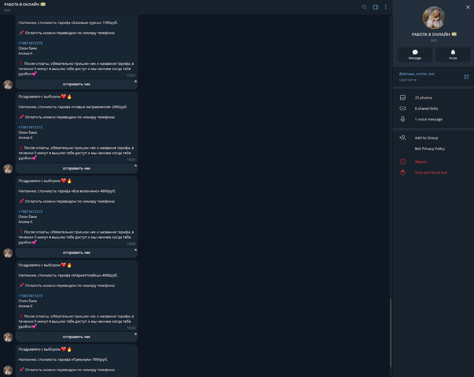 Оплата любых тарифов проходит переводом на карту физлица через Озон Банк, чек от компании не выдается. Также заметим, что заявленные сертификаты не имеют государственного статуса, а их ценность подтверждается только словами админа. В рекламных сообщениях постоянно фигурируют формулировки «доход от 100,000 ₽ в первый месяц» или «заработок от 200,000 ₽», однако расчеты, требования к навыкам и возможные риски не уточняются.