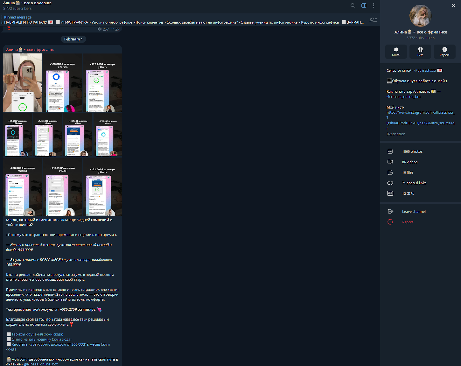 В сети большинство независимых комментариев – негативные. Положительные упоминания публикуются только внутри канала «Алина – все о фрилансе» в формате скриншотов. Клиенты пишут благодарности и публикуют фото переведенных сумм с историями про десятки тысяч рублей за день. Заметим, что под постами нет комментариев, ссылки на авторов отсутствуют, а личности комментаторов проверить невозможно.