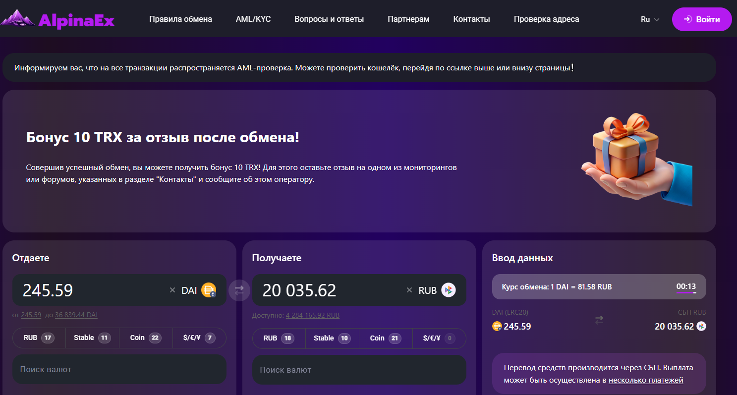 Криптообменник Alpinaex предоставляет широкий выбор направлений обмена, поддерживает криптовалюты и СБП.