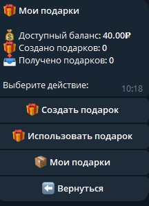 Партнерская программа приносит 30% от пополнений друзей. Бонусы можно тратить на VPN или вывести деньги. Функция подарков позволяет создавать презенты или получать их от других. Доступный баланс показывает сколько подарков получено.