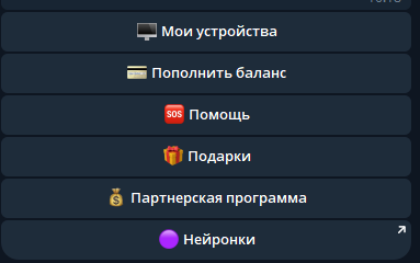 Интерфейс разделен на несколько разделов. Устройства, баланс, помощь, подарки. Еще партнерка. В разделе устройств управляешь файлами конфигурации. Добавляешь новые гаджеты или удаляешь старые. Просматриваешь ранее созданные подключения.