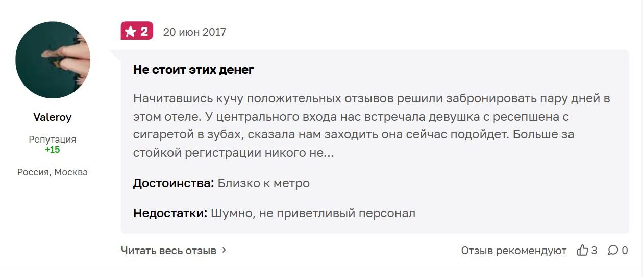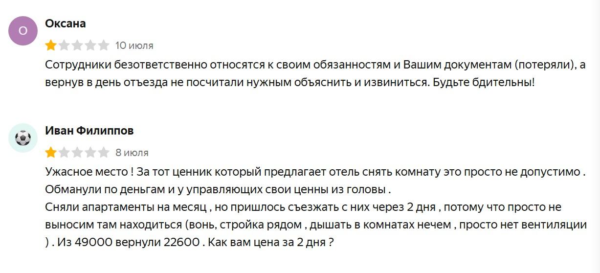В отрицательных отзывах клиенты жалуются на плохую уборку номеров, отсутствие хорошей вентиляции, неприветливость сотрудников, рассказывают о неприятных инцидентах, которые произошли с ними за время проживания в отеле.