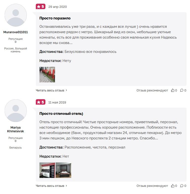 В положительных отзывах люди отмечают высокий уровень сервиса, чистоту, приемлемые цены, красивые номера, близость от метро.