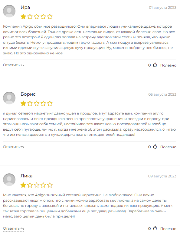 На ноябрь 2025 года отзывы о компании Apl Go носят негативный характер. Пользователи называют схему заработка на инвестициях в проект лохотроном и настоятельно не рекомендуют проходить обучение от AplGo LTD.