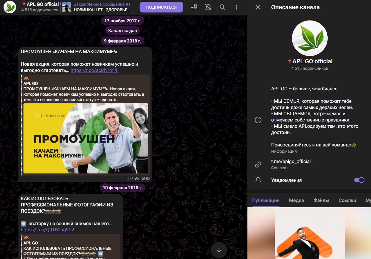 ООО «ЭйПиЭл РУС» активно привлекает новых клиентов через публичные каналы в популярных социальных сетях и мессенджерах. Например, телеграмм-канал был зарегистрирован в ноябре 2017 года, но первый пост появился только в феврале 2018 года. Команда называет себя полноценной семьей и предлагает каждому желающему присоединиться.