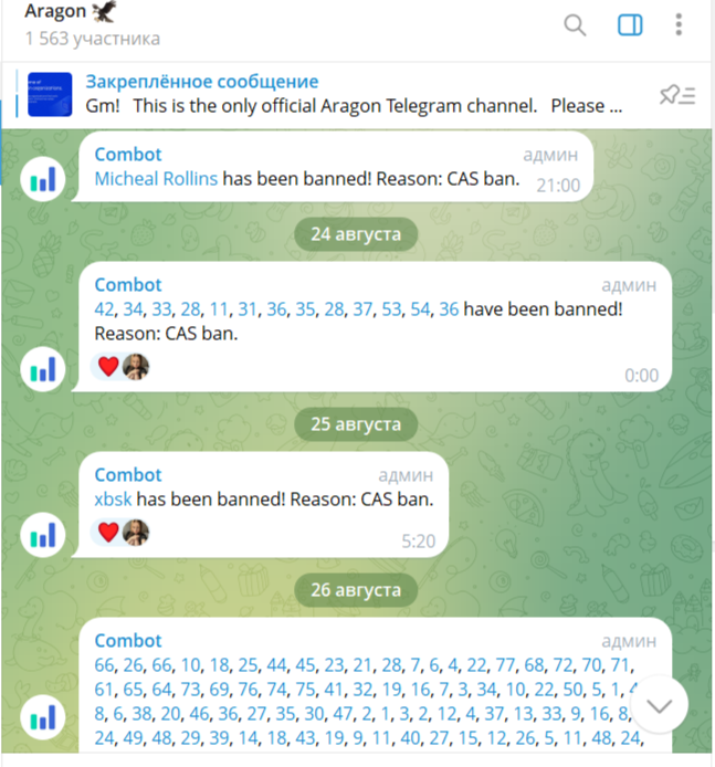 «Беседа» с ником @AragonProject закрыта, как попасть в нее, неизвестно. Здесь публикуются только сообщения админа о том, кто из членов чата отправляется в бан, иной информации здесь нет.