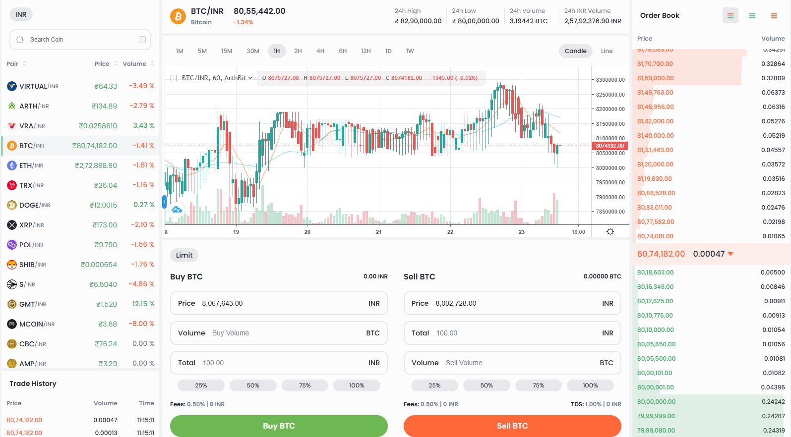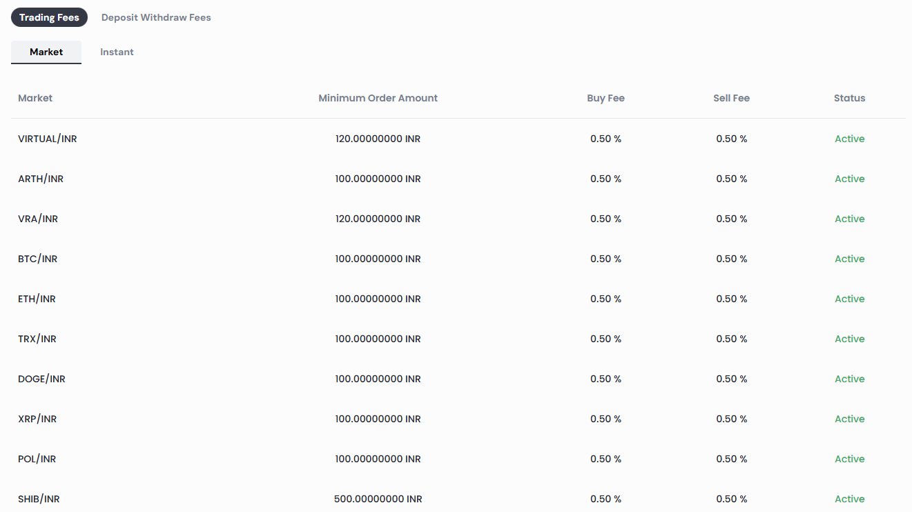 Минимальный ордер на Arthbit от 100 рупий. Зависит от пары – иногда 120. Комиссия за сделку – 0,5% при покупке и продаже. Для Индии это обычная ставка. Платформа поддерживает Bitcoin, Ethereum, Ripple, Tron, Dogecoin, Shiba Inu, Solana. Всего 60+ активов.