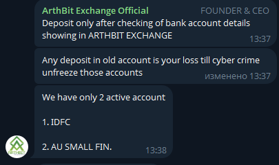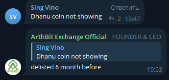 В телеграм-чате ArthBit Exchange Official (ArthBitExchange) постоянно жалуются на задержки вывода. Транзакции висят по несколько дней. Администратор просит подождать. Иногда пишет, что все обработано. Запрашивает email для проверки статуса.