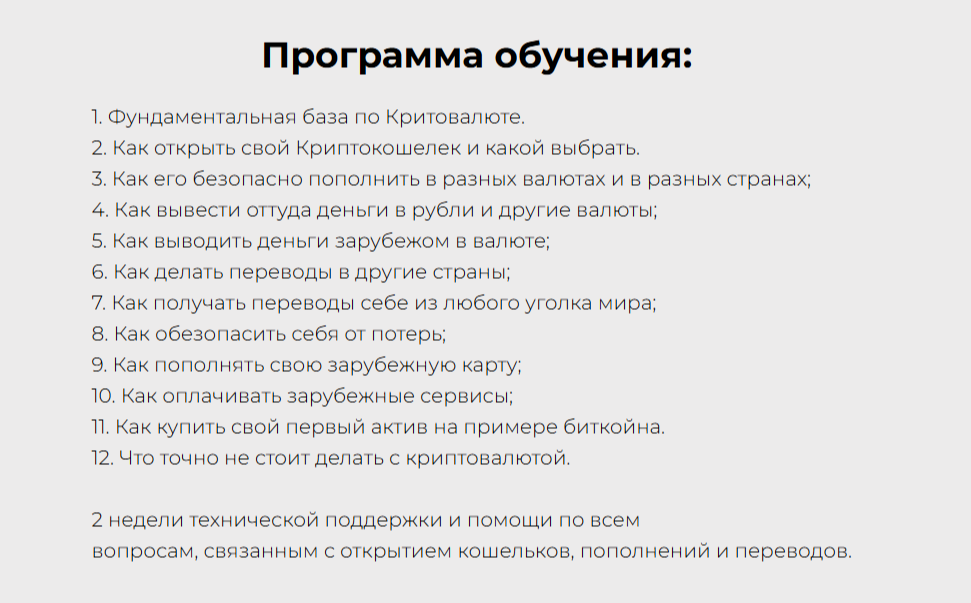 Курс Артема Черепанова о взаимодействии с криптой имеет формат видео. Программа обучения предусматривает изучение вариантов открытия криптокошелька, ввода и вывода средств в различной валюте, оплаты зарубежных сервисов криптой и т. п.