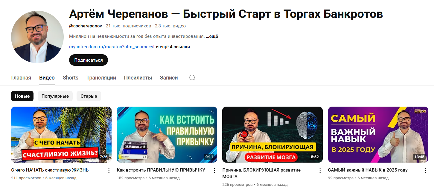 Канал «Артем Черепанов — Быстрый Старт в Торгах Банкротов» с 2012 года существует на Ютубе. Он имеет 21 000+ подписчиков. В ленте представлены видео на тему с чего начать счастливую жизнь и как быстро увеличить капитал. Возможно, эмоциональные мотивационные ролики не слишком интересны подписчикам канала. Так как они набирают в итоге до 250 просмотров.