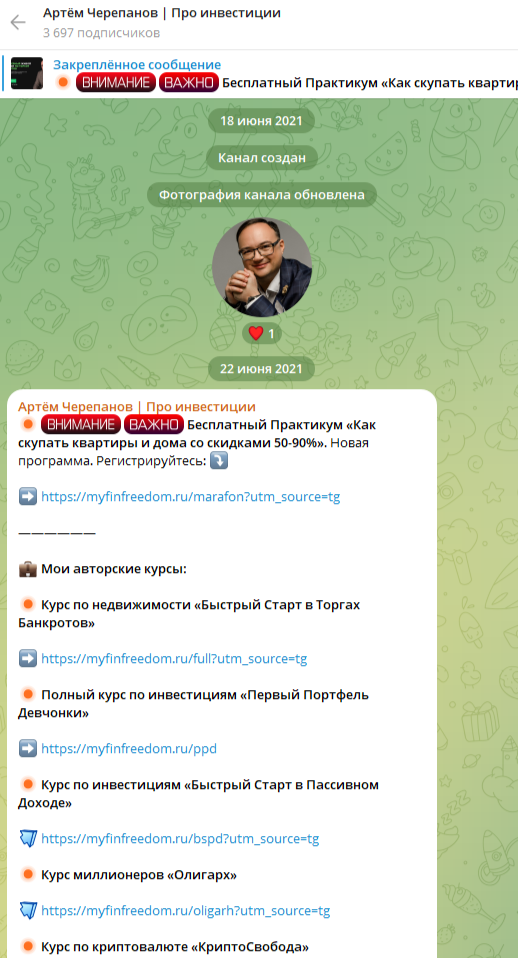При желании пользователи обнаружат телеграм-канал «Артем Черепанов Про инвестиции». Создан данный проект 18 июня 2021 года. Имеет он 3 697 подписчиков. Лента ресурса содержит рекламу всевозможных авторских курсов, а также призывы вкладывать инвестиции в недвижимость.