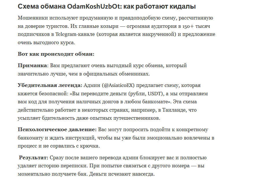 Схема сотрудничества выглядела просто: пользователь пишет администратору, уточняет курс и сумму, затем переводит средства на указанную карту или криптокошелек. AsiaticoEx обещал после подтверждения платежа прислать код, который вводится в банкомате VietinBank, BIDV или другого крупного банка. Заявлялось, что деньги можно забрать моментально, без лишних встреч и документов.