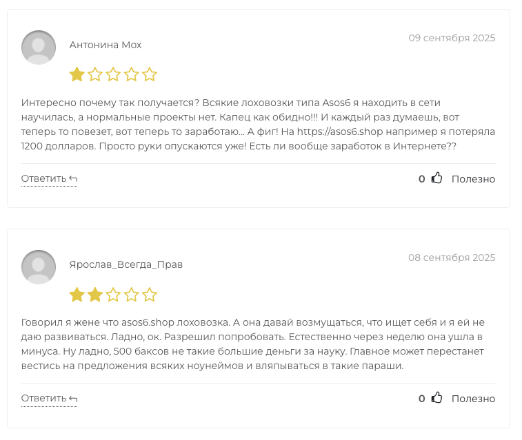 - все отзывы об asos6 shop негативные — опубликовавшие их люди написали, что в результате работы на платформе потеряли тысячи долларов;