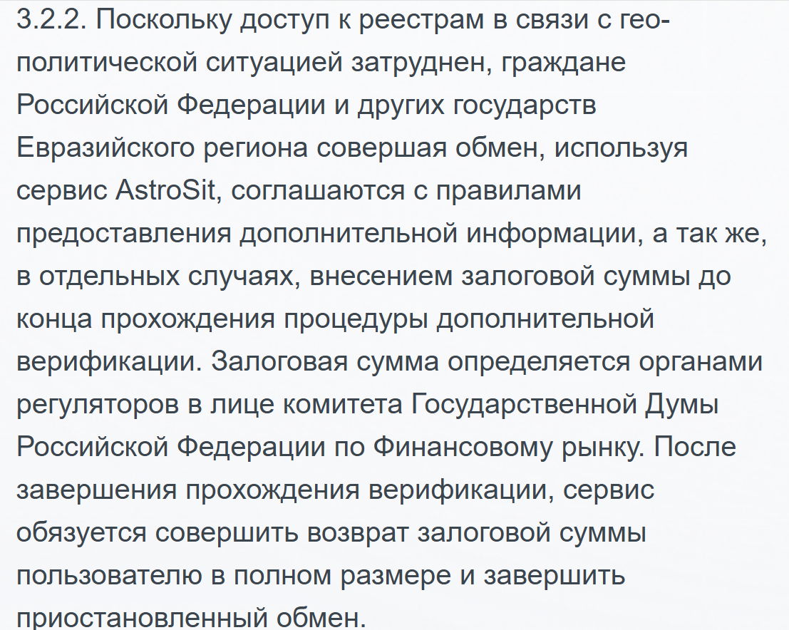 Правила работы Astrosit exchange жесткие. Оплатили заявку и передумали. Возврата не будет. Это четко прописано в пункте 4.12 соглашения. Деньги назад не вернут.Пункт 3.2.2 вообще странный. Там говорится про залоги и «сложности с доступом к реестрам из-за геополитики». Размер залога якобы определяет Комитет Госдумы по финансовому рынку. Бред полный – никакая Госдума не регулирует частные обменники. Абсурдная формулировка.