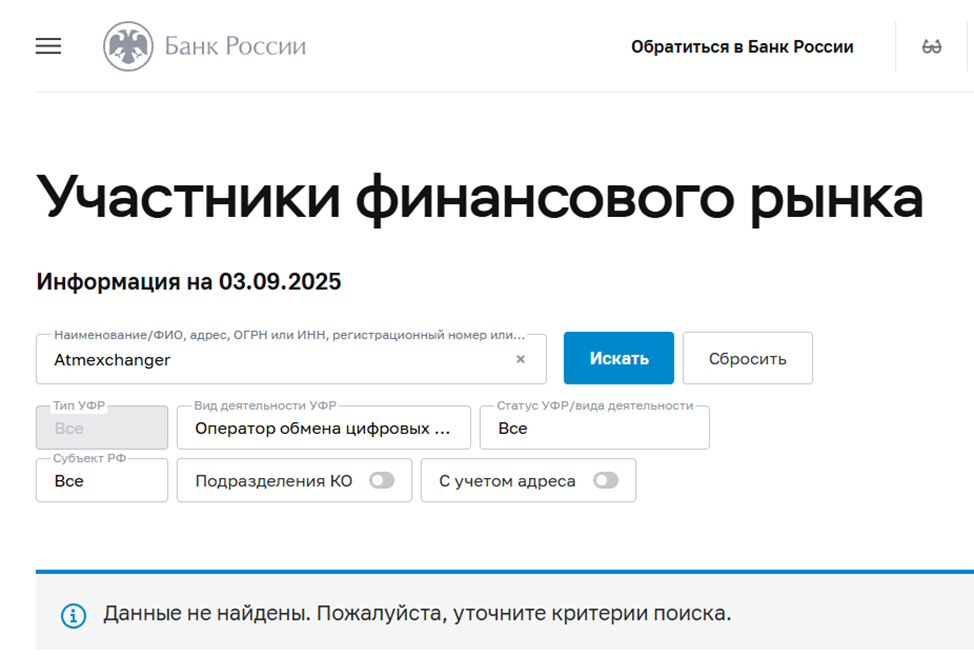 Сайт обменного пункта поддерживает русский язык, следовательно, рассчитан на граждан РФ. Несмотря на длительный период работы Atmexchanger не получил лицензию в Банке России и действует незаконно. Пользователи его услуг не могут рассчитывать на защиту со стороны регулятора и правоохранительных органов.