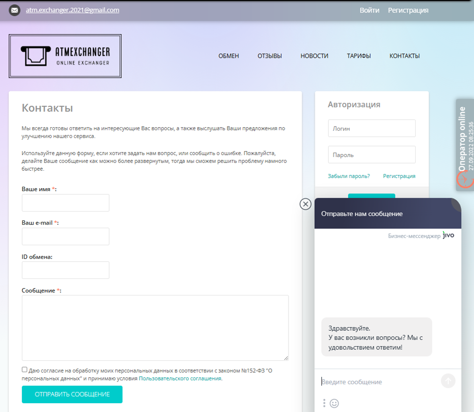 График работы сервиса Atmexchanger Online Exchanger по будням с 8:00 до 20:00. В субботу и воскресенье – свободный график. Связаться можно, написав на электронную почту Atm Exchanger 2021 Mail Com (проверка показала, что она действующая), через онлайн-чат или оставив свои данные в форме обратной связи. Несмотря на достаточный перечень контактов у обменника нет конкретного адреса и телефона, фактически все контакты полностью анонимны.