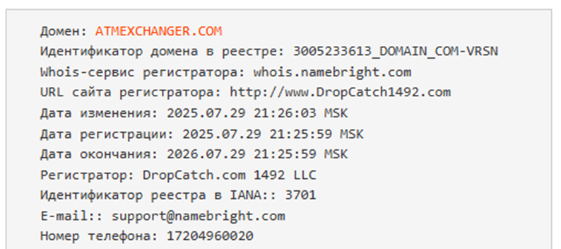 Домен Atmexchanger Com зарегистрирован совсем недавно – 29 июля 2025 года. Одновременно по данным веб-архива сайт существует с 2021 года. Можно прийти к выводу, что сервис прекратил свою деятельность, а ресурс был выставлен на продажу и новые собственники могут использовать заработанную репутацию в свою пользу.