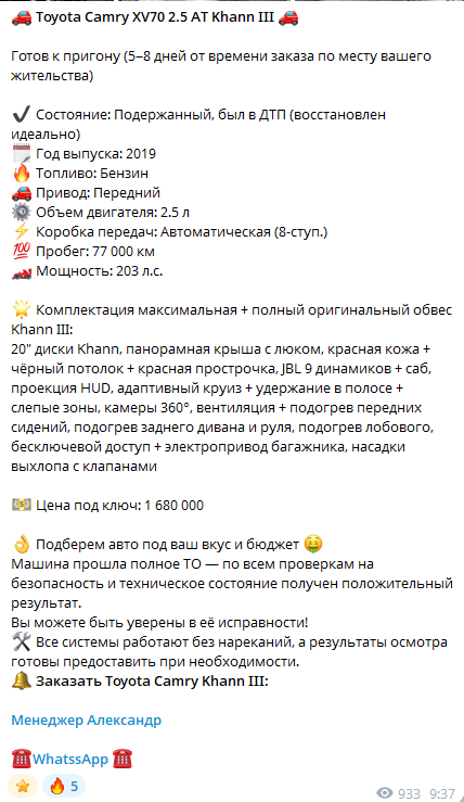В завершении каждого поста размещается однотипный призыв к действию, контакт менеджера, ссылка на WhatsApp и заверение в прозрачности сделки. Повторяющиеся формулировки, идентичные описания, отсутствие различий в сценариях покупки говорит о том, что менеджеры проекта сами автомобили не осматривают. Они работают по заранее заданным шаблонам.