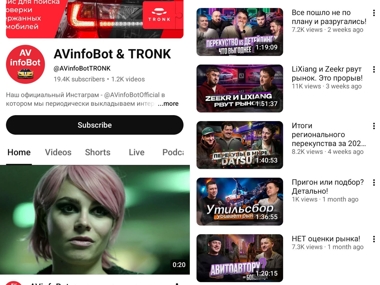 Опубликовано свыше 1 тыс. видео, направленных на советы для новичков по авторынку, схемы перекупов и другое. Ролики постят несколько раз в месяц. Создатели бота Авинфо не предоставили ссылки на тг-канал проекта.